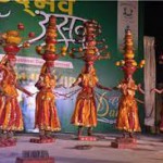 One of the girls carries the pot on her head and stands as a revolving figure in the middle of the group to face the dancing row when the opposite row of the girls alternatively stops. In this dance no instrument is used with the exception of a wooden clapper named Thiski is played to provide rhythm, where the Gonds and the Baigas predominate.