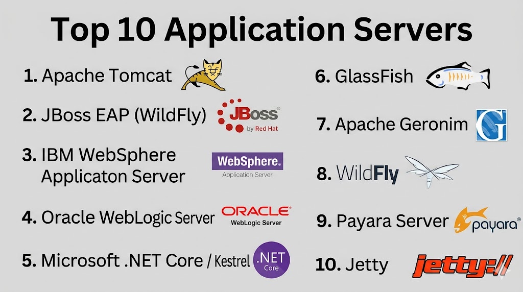 Application servers are critical for delivering robust, scalable, and secure applications. Lightweight open-source options like Tomcat, Jetty, and WildFly suit developers and SMBs, while enterprise-grade servers like WebLogic, WebSphere, and JBoss EAP handle mission-critical workloads with high availability and compliance. Organizations should evaluate workload requirements, scalability, and integrations, shortlist 2โ3 servers, and run pilots to ensure optimal performance, security, and operational efficiency.