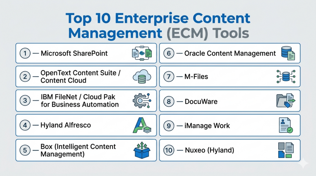 Enterprise Content Management (ECM) platforms are essential for organizations dealing with complex, high-volume content workflows. They provide structured governance, automation, and secure access across the enterprise.