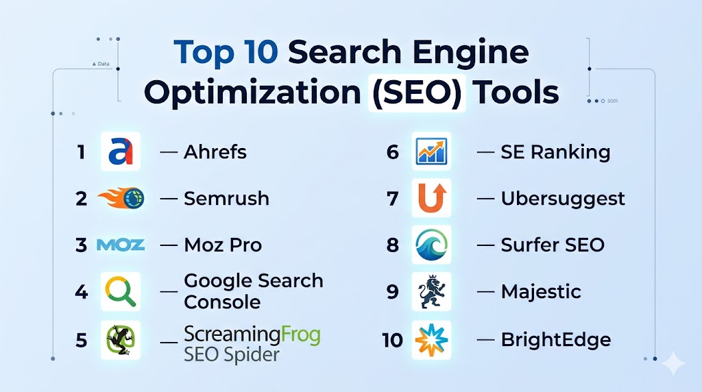 Search Engine Optimization (SEO) Tools help businesses improve website visibility in search engines, attract organic traffic, and grow qualified leads without relying only on paid ads. These tools support keyword research, technical audits, backlink analysis, rank tracking, content optimization, competitor research, and reporting.