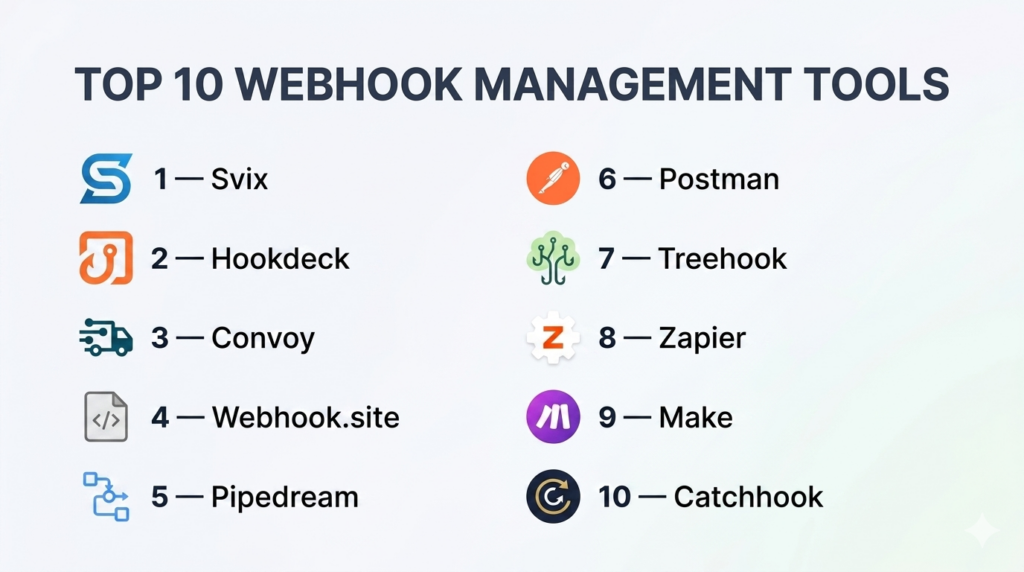 Webhook management tools help businesses send, receive, monitor, secure, and troubleshoot webhooks at scale. A webhook is an automated HTTP callback that sends real-time data when an event happens, such as a payment success, new signup, order update, or deployment event. While basic webhooks seem simple, production-grade webhook operations require retries, logging, replay, routing, security, filtering, rate limiting, and observability. That is where dedicated tooling becomes valuable.