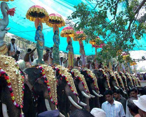 Athachamayam a colourful ceremony held at Thripunithura in Ernakulam District, Kerala.Onam, the state festival of Kerala, commences on the Atham asterism of the Malayalam month Chingam. If you plan to visit Kerala on the occasion of Onam, you should never miss this simply splendid celebration. A colourful procession is the most attractive part of Athachamayam. Caparisoned elephants, traditional art forms like Kathakali, Mohiniyattam, Thiruvathirakali, Theyyam and Pulikali, musical ensembles like Chendamelam and Panchavadyam?. the venue of Athachamayam is a rare occasion to enjoy all these.The festival starts on the Atham day of Chingam (Leo), which is a Malayalam month. This Malayalam month usually falls either in August or September. Some believe that this day is followed ever since the ruling King of Kochi took out a march to display the regal glory and splendor of Lord Mahabali."For the local Keralites, this occasion marks the beginning of 10-day festivities that conclude on the Thiruonam Day with lots of food and variety of curries served on banana leaf platter.Floral carpets are also made during Athachamayam. |