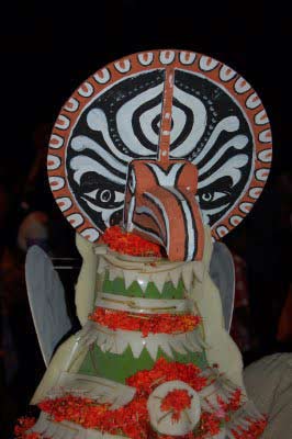 Palli Bhagavathy Temple is located at Neelamperoor, Kottayam district, Kerala. One of the most colourful and mythological festival in Kerala, the Neelamperoor Padayani is associated with the annual festival of the Neelamperoor Bhagavathy temple. Padayani, literarily means rows of army. Padayani is a symbolic victory march of goddess Kali after vanquishing Darika.The festival Pooram Padayani of this temple is a rare and unparallelled phenomenon because it represents a synthesis of the Buddhist and Hindu cultures. It is strikingly similar to the Buddhist festival seen by Fahiyan, the Chinese traveler in Padaliputra (Patna in Bihar). It also resembles the ceremonies held in Sreemoolavarom which was once a budhist centre in Kerala. During the pooram festival, decorated motifs of Swans; both large and small, form part of the Kettukazcha the symbolic offering made to the Goddess. These are then carried in a procession, on the main day of the festival in which bigger ones are moved on platforms with wooden wheels and smaller ones carried on the shoulders of devotees. A unique aspect of the motif decoration here at Neelemperoor is the sourcing of different colours.The required colours are taken from the surroundings, in the form of leaves, flower petals, parts of the coconut tree and other local plant varieties. The festivals of the temple are two in number- the ten day festival in the solar month meenam with its ninth day falling on pooram and the pooram padayani which starts from the day next to Thiruvonam in Chingam (the first solar month of the Keralite calendar) and lasts till Pooram, the birth day of the deity.The procession is conducted at night and in its course towards the temple; it is accompanied by the reverberating beats emanating from several drums (Chenda) along with clanging of Cymbals that fills the air with a captivating rhythm.This is shot of a huge swan made of natural things like lotus levees ,plantain stem hibiscus flower etc, presented before goddess on midnight of the padayani day. |